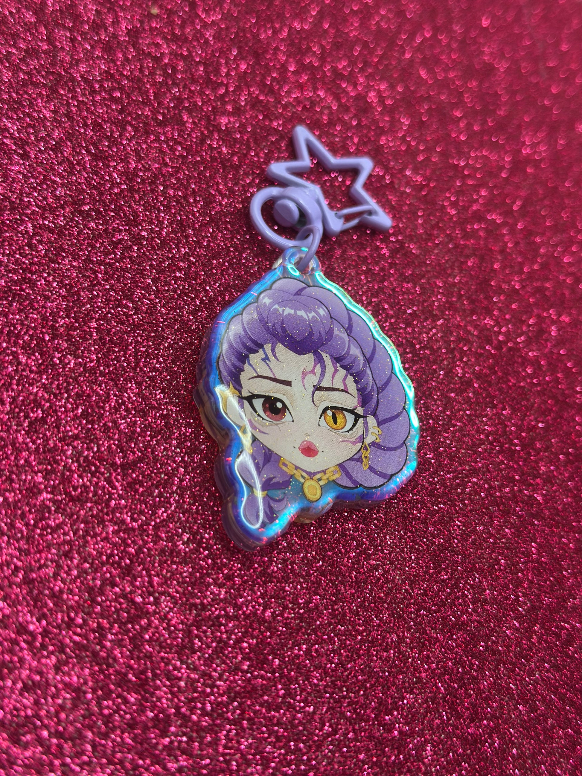 Red Holo front side glitter epoxy 2” keychain with purple star clip. Limited run!